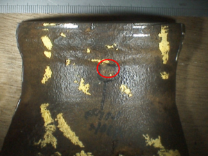 Figure 1 & 2 Flange section, showing pinhole at (a) external surface and (b) internal surface