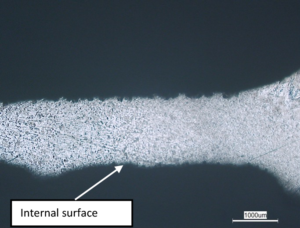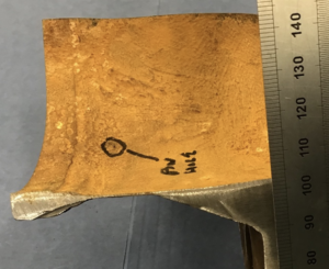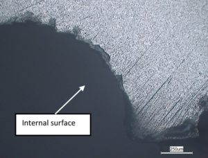 An area of perforation was present close to a circumferential weld, Figures 1 and 2. The internal surface of the flange exhibited significant metal loss and severe thinning associated with a yellow-coloured corrosion product. Upon sectioning, the degree of thinning was clear, Figures 3 to 5.