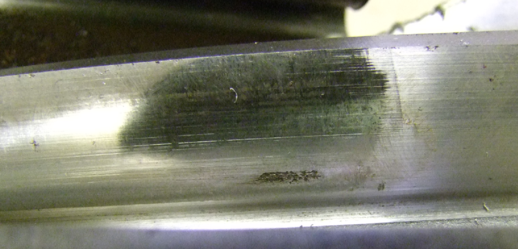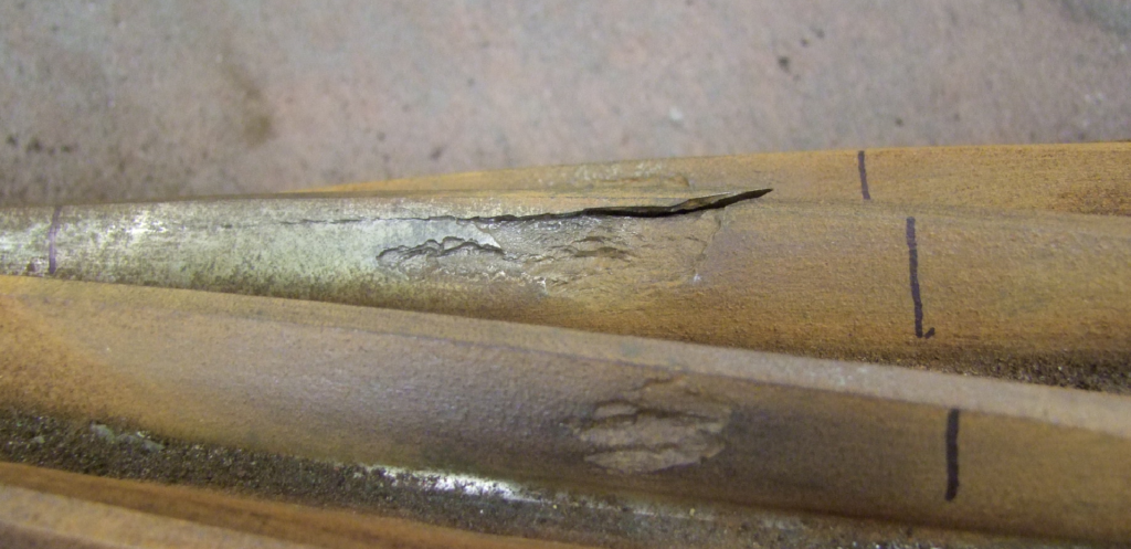 The damage observed was consistent with spalling which occurs when several pits join or when a crack runs parallel to the surface for some distance. Some of this damage was associated with through-wall cracking, the fracture surface of which exhibited multiple start marks and beach marks, see Figure 5. SEM examination of the area revealed the presence of striations across the surface, see Figure 6.