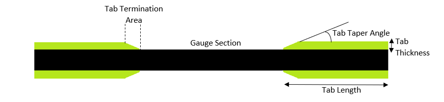 Material choice for end tabs can influence both the measured properties and the ease of use through future operations. The chosen material should be as compliant as possible, without losing the strength necessary to transfer the load from the grips to the specimen’s gauge section. It must also be sufficiently tough to withstand the harsh tearing action of the grips.